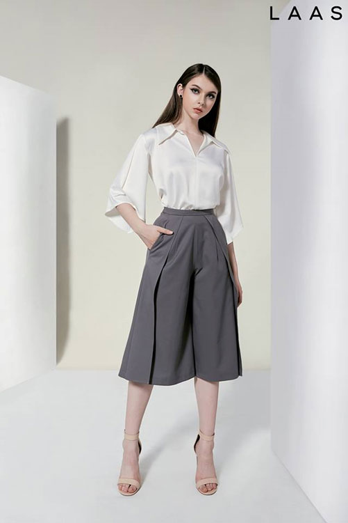 Chiếc áo somi trắng phá cách ở tay áo kết hợp cùng quần ống rộng rã xéo tạo nên một cái nhìn tinh tế tổng thể cho nguyên set sản phẩm.