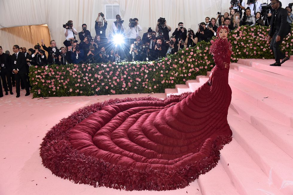 Cardi B mặc một chiếc váy dài đến 3m của Thom Browne, đính 30000 chiếc lông vũ nhuộm màu cùng chiếc mũ vô cùng ấn tượng do Stephen Jones & Thom Browne đồng thiết kế.
