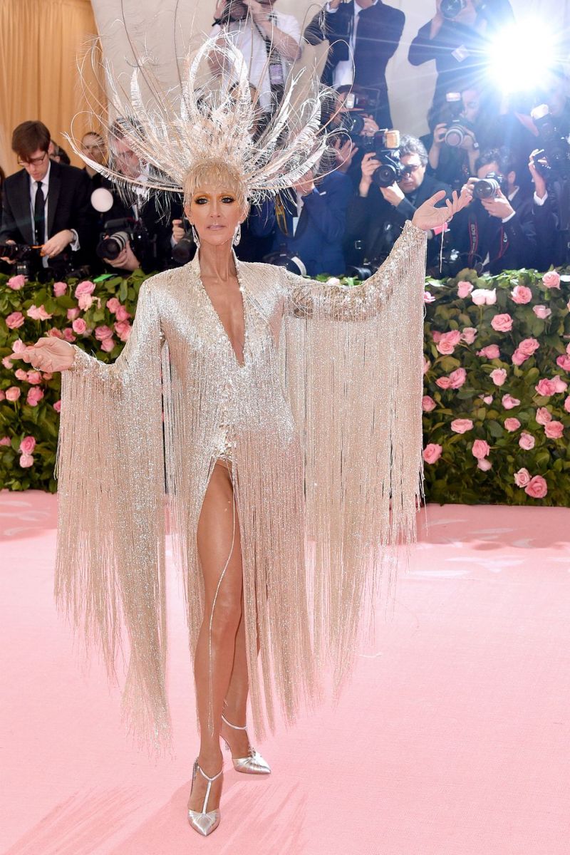 Celine Dion diện một chiếc bodysuit tua rua lấp lánh của nhãn hiệu Oscar de la Renta. Thiết kế độc đáo này được đính kết từ 18 mảnh vàng siêu nhỏ, thực hiện bởi 52 nghệ nhân khéo léo trong suốt 3000 giờ và nặng hơn 10kg.