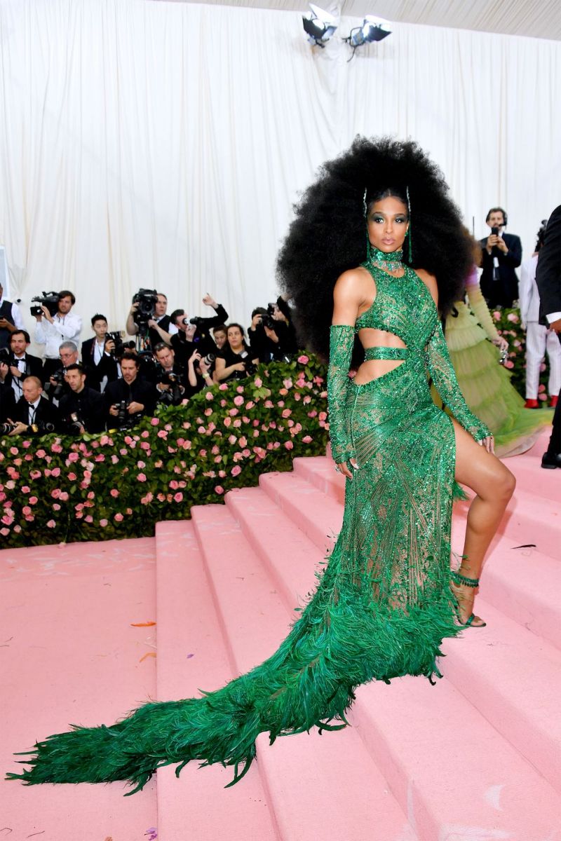 Không thể chê vào đâu được từ mái tóc mang phong cách Diana Ross cùng bộ váy dạ hội màu xanh lá cây với lông đà điểu của Dundas kết hợp găng tay, thắt lưng và vòng cổ tông xuyệt tông.