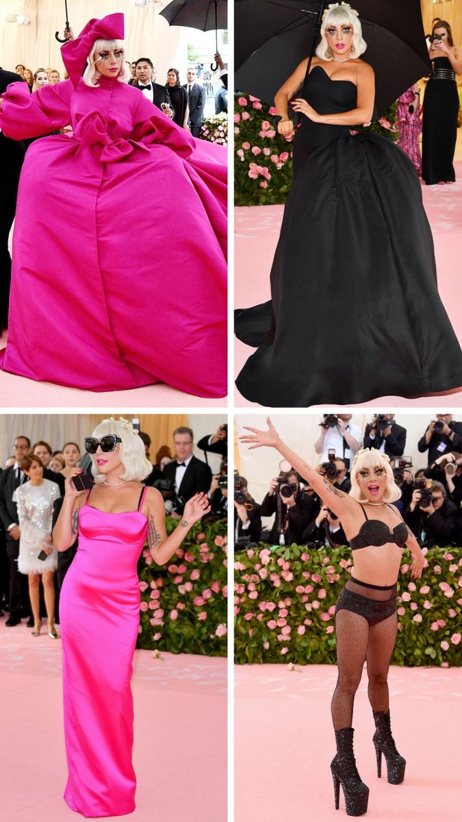 Là một trong những người chủ trì năm nay, Lady Gaga đã không gây thất vọng với chiếc váy “4 trong 1” của Brandon Maxwell cùng màn trình diễn “thay đồ” cực kỳ ấn tượng trên thảm đỏ Met Gala. Lần lượt là chiếc váy nơ búp bê hồng khổng lồ, đầm cúp ngực đen sang trọng, đầm hai dây hồng cùng điện thoại di động đồ sộ, cuối cùng là nội y đen với quần tất lưới gợi cảm và tất nhiên không thể bỏ sót đôi boot cao lấp lánh độc đáo.