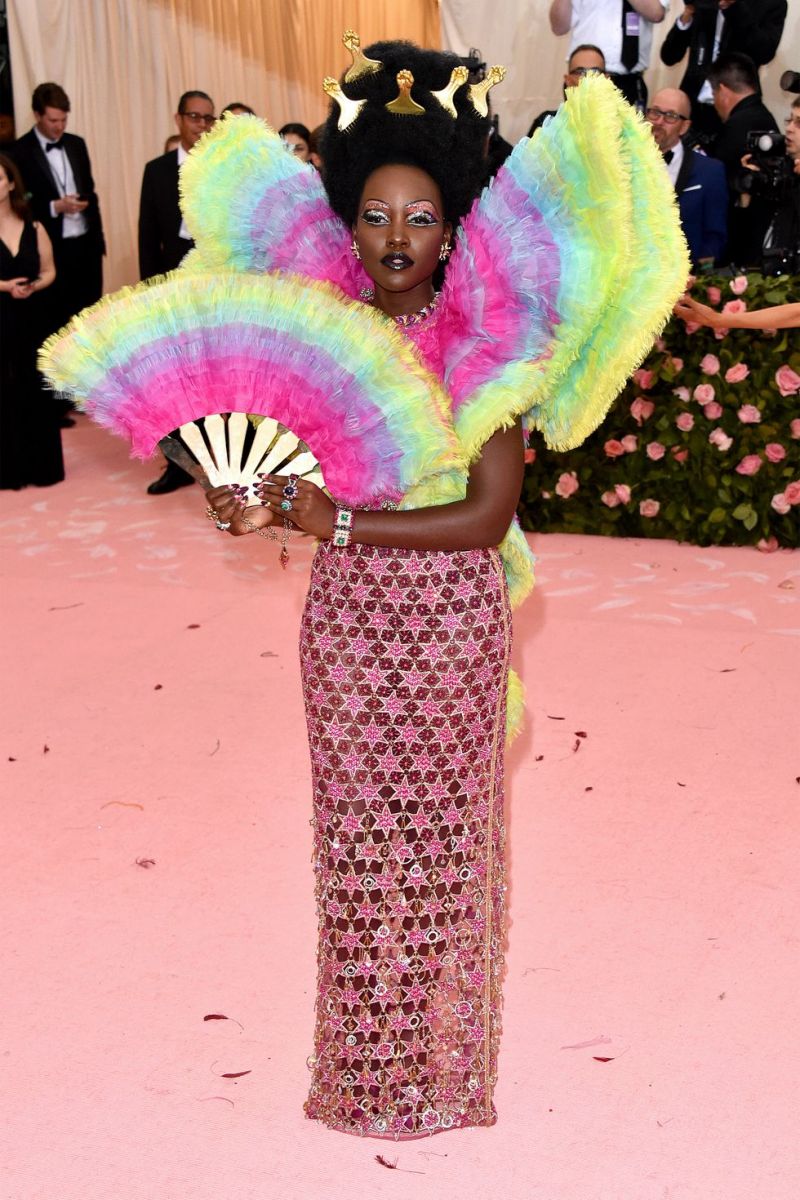 Cũng chọn Versace để tỏa sáng trên thảm đỏ Met Gala, Lupita mặc chiếc váy maxi kim sa màu hồng có cầu vai bảy sắc cầu vồng rực rỡ và chiếc quạt cùng tông khiến mọi người không thể rời mắt.
